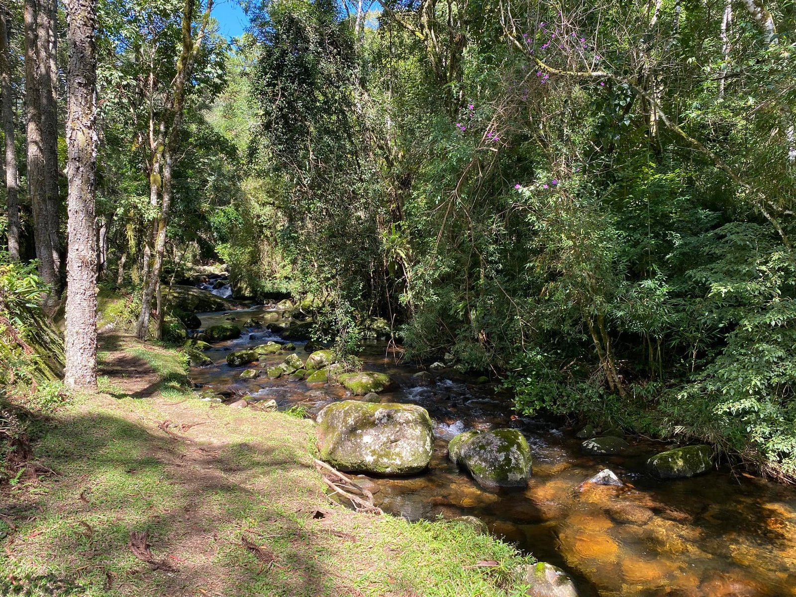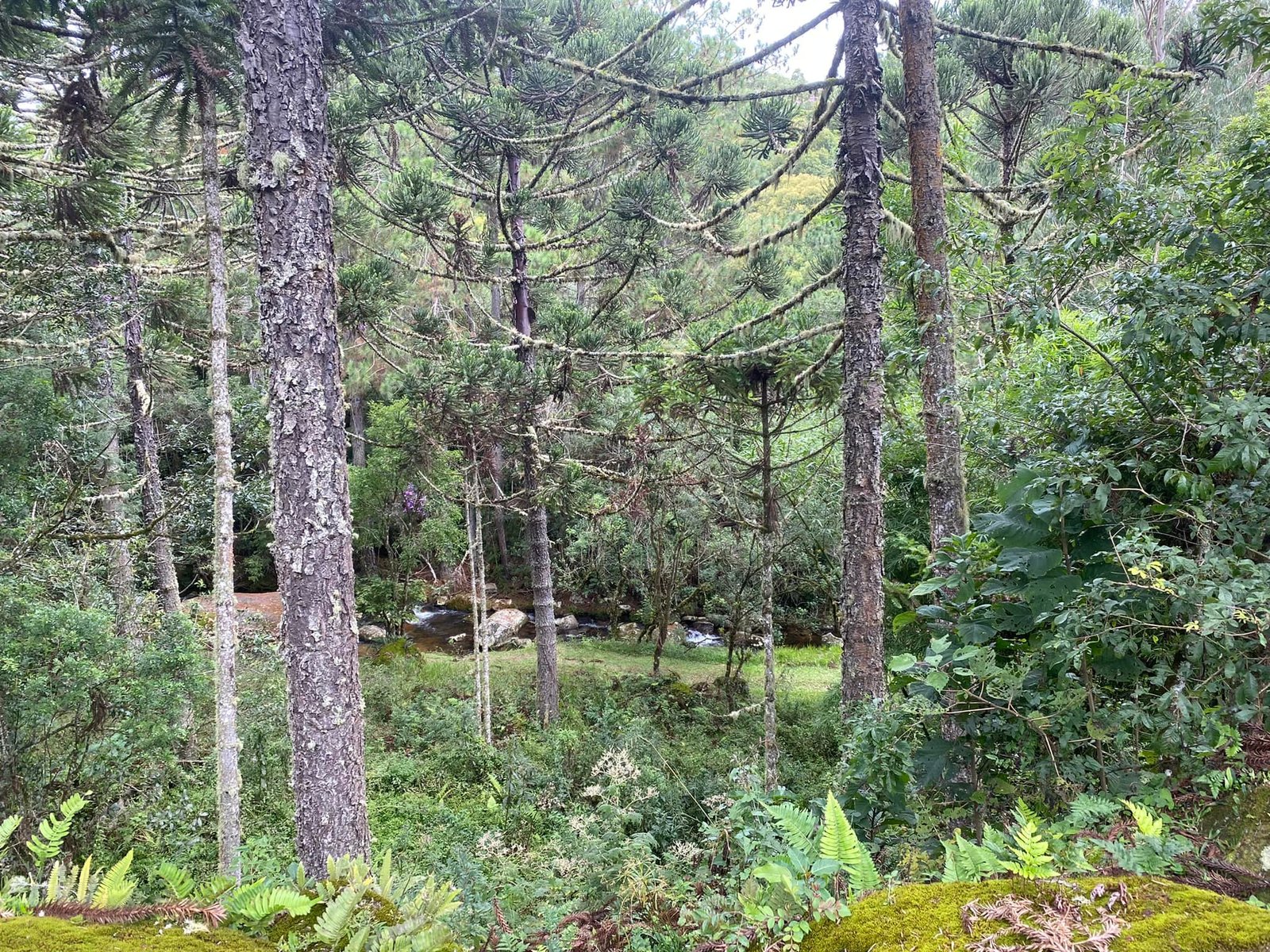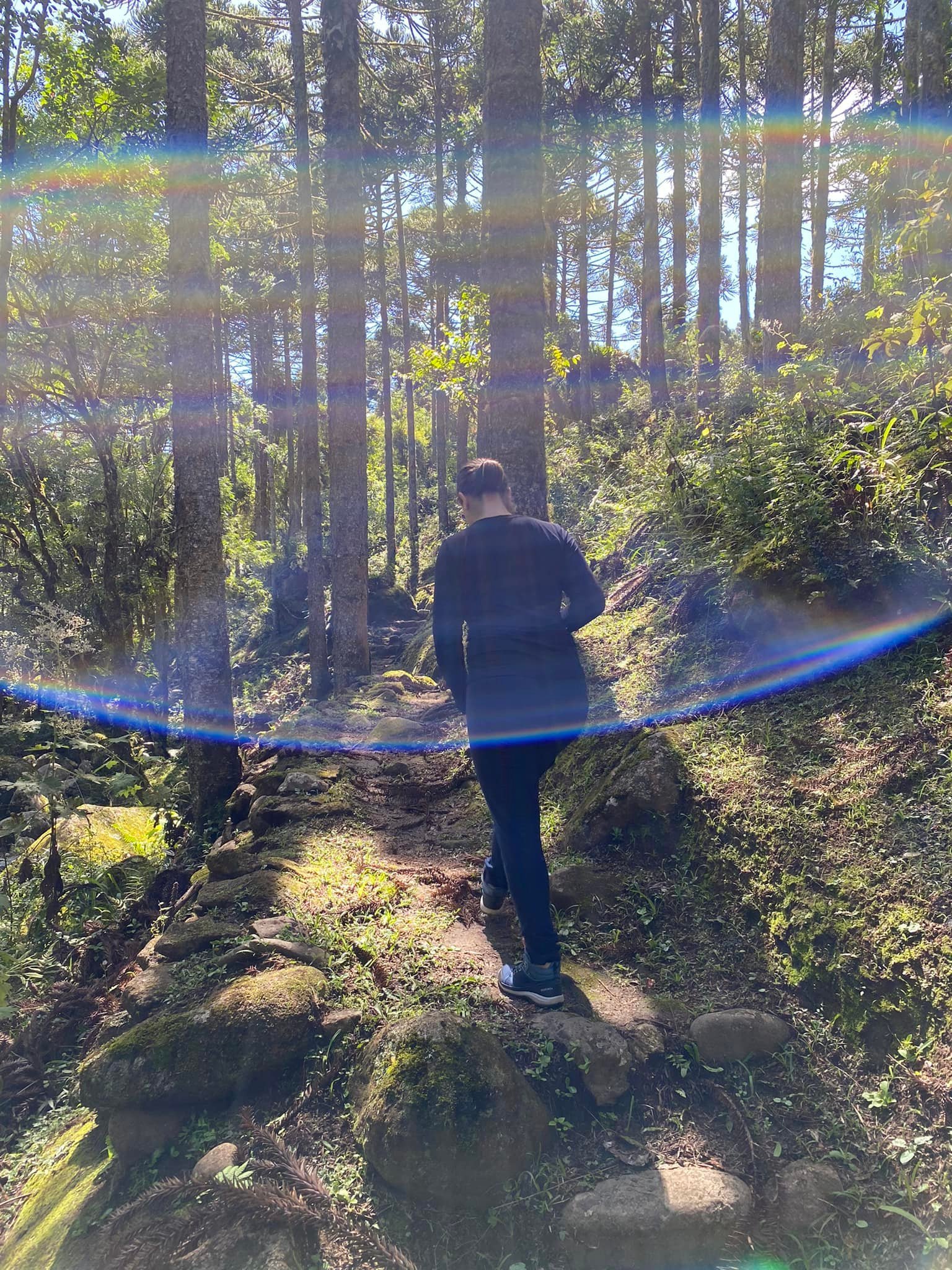Chegamos na bica de água que fica na parte final da floresta. Ali me sentei numa pedra e a Eliane foi encher nossas garrafinhas com água. O sabor da água da bica era bem melhor do que da água do riacho. A chuva deu uma aumentada e quando o frio começou a apertar, seguimos em frente. A Eliane foi guerreira, sempre indo na frente escolhendo o melhor caminho e ao mesmo tempo iluminando o meu caminho e me ajudando em alguns trechos mais difíceis, principalmente em descidas onde eu tinha mais dificuldade por culpa das dores. Se não fosse ela, acho que teria que ter sido resgatado.