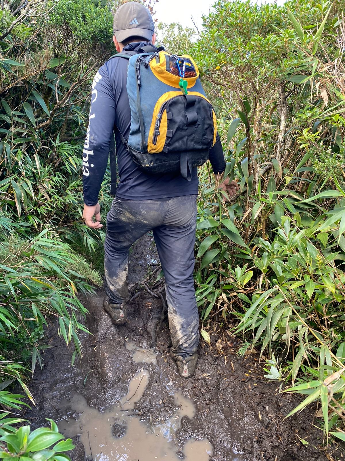 Passada a primeira meia hora meu corpo foi aquecendo e a caminhada seguiu normal. Fizemos breves paradas para descanso e assim fomos avançando montanha acima. Utilizava um casaco sem mangas e levei um casaco mais quente na mochila, para quando começasse a sentir muito frio. Até o Getúlio nossa caminhada foi relativamente tranquila. Chegando no Getúlio o tempo fechou, ventava forte e chovia. Passámos rápido por essa região e logo entramos na mata novamente, o que nos protegia um pouco da chuva. Quando paramos na encruzilhada onde ficam as plaquinhas que indicam as trilhas para as várias montanhas do lugar, fizemos uma parada para descanso um pouco mais longa. A partir dali começaria a parte que menos gosto da subida, que é a parte da floresta. Nessa parte quase sempre estamos subindo e tem muitos galhos, pedras, cordas e grampos para transpor. Para piorar, o terreno ali estava muito molhado, com barro e em algumas partes um lamaçal de dar medo.
