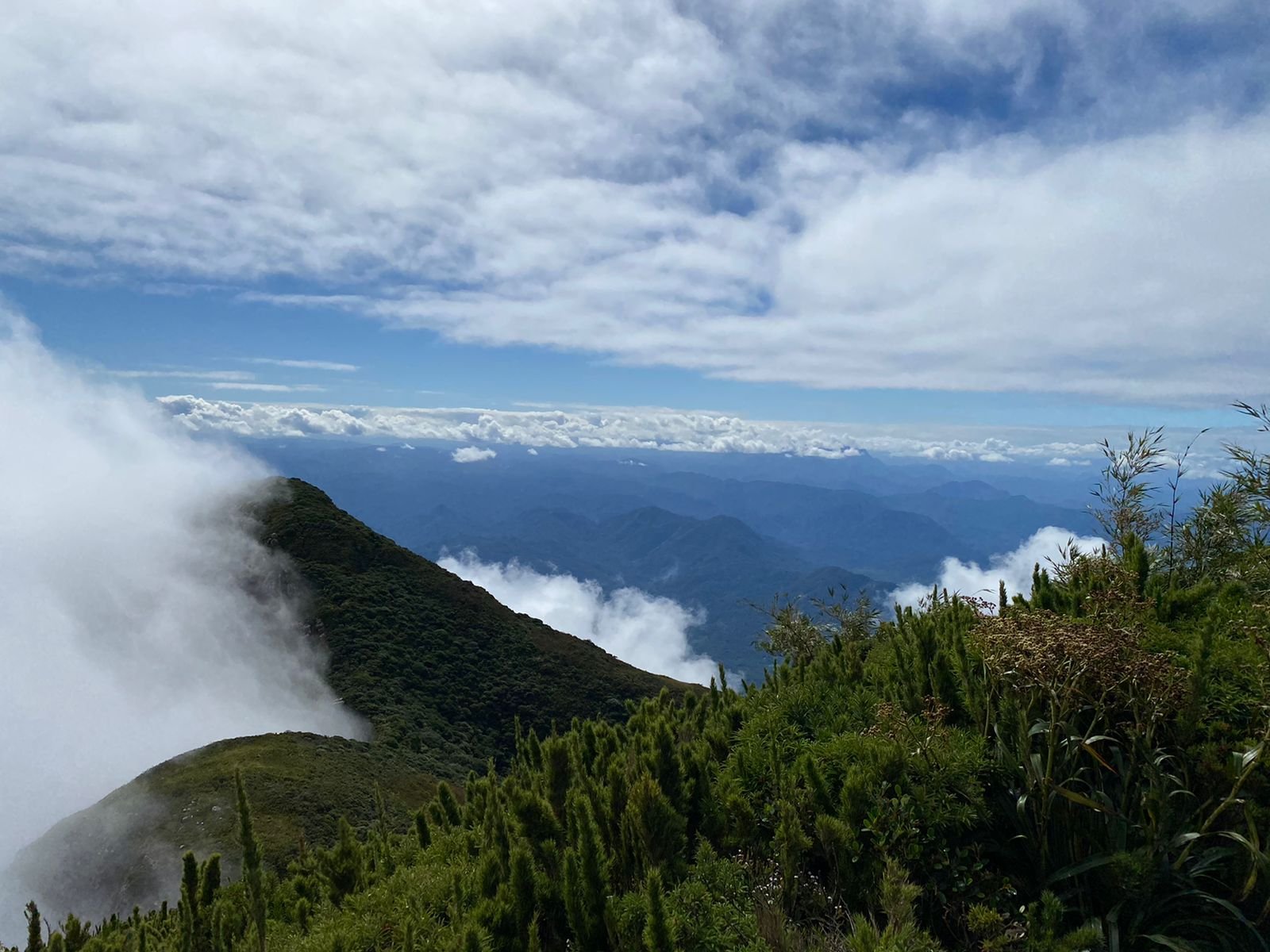 Ventava bastante lá no cume e logo comecei a sentir frio. Tinha uma grande rocha numa das extremidades do cume e fiquei um tempo abrigado atrás dessa rocha, o que fazia a temperatura subir um pouco. Desse lado do cume a vista também era muito bonita, com muitas montanhas menores surgindo em meio ao mar de nuvens. Logo dois outros grupos chegaram ao cume. Fiquei mais um tempo abrigado atrás da rocha e logo voltei para próximo do pessoal do meu grupo. Então um dos caras que tinham chegado por último ao cume, veio me perguntar sobre a calça de ciclismo que eu usava, se ela era quente, confortável. Ele disse que tinha visto muitos caras usando calças de ciclismo na trilha e que estava querendo comprar uma para quando fosse subir outras montanhas. Eu que no dia anterior achei que seria um grande mico usar calça justa de ciclismo na montanha, agora estava dando dicas sobre tal calça.