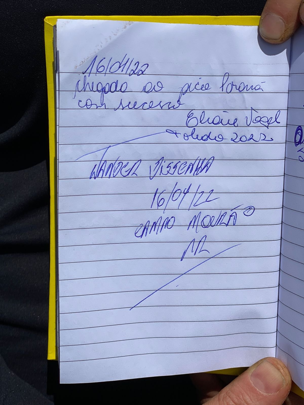 Seguimos em frente e exatamente às 10h40min chegamos no cume do Pico Paraná. Estávamos no ponto culminante do sul do Brasil, sob um sol que se não era dos mais quentes, servia para queimar um pouco nossa pele. Era minha terceira vez no cume do PP e a primeira vez da Eliane. Estava mais cansado do que ela e com as dores nas costas não curti tanto estar ali no cume, como curti das outras duas vezes que ali cheguei. Nos sentamos numa pedra e enquanto descansávamos ficamos curtindo a linda paisagem em volta. Também aproveitamos para lanchar, beber água e dividir um Gatorade. E registramos nossos nomes no caderno de cume, que fica numa caixinha em cima de uma pedra. Estava preocupado com minhas dores, já pensando na descida. Sabia que descer com dor seria complicado e nos atrasaria. Outra preocupação era com relação a minha lanterna, pois sabia que ela não teria bateria suficiente para descer no escuro caso nosso atraso na descida fosse grande e o escuro nos alcançasse antes do previsto. Não externei muito minhas preocupações para a Eliane, pois não tinha porque deixá-la preocupada naquele momento. Queria que ela curtisse sua conquista e aproveitasse ao máximo os minutos que ficaria ali no cume. A descida e seus problemas, deixaria para me preocupar conforme eles acontecessem.